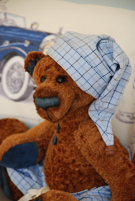 Gimė 2012 m. kovo mėn. pagal specužsakymą. Specužsakovas - mano penkių metukų sūnėnas :) - mažyliui reikėjo būtent meškio būtent tokiu vardu. 41 cm. Pasiūtas iš viskozės kailiuko. Pirmą kartą dirbau su šios rūšies kailiu - meškiukas tarsi tikras pliušinis, kaip iš mano vaikystės. 3D-pėdutės :) ir delniukai - iš seno aksomo. Penki sujungimai, stiklinės akutės-"batų sagutės", nosis siuvinėta bei lakuota, kimštas sinteponu ir stiklo granulėmis. Patonuotas dėl tvarkos, trupučiuką, taigi tai dar vienas personažas iš serijos "galima žaisti" :) Dėvi pižamos kelnes ir naktinę kepurę, juk planuoja apsigyventi savo mažojo šeimininko lovoje. Ant kulno turi žalvarinę plokštelę su graviruotu vardu bei pirmo (penki metai) jubiliejaus data.